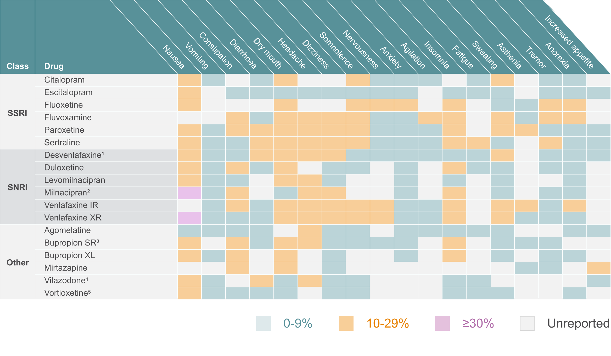 When data from multiple doses were reported separately, the data from the minimum therapeutic dose was used (indicated by footnotes). Percentage rates taken from product monographs (based on clinical trial data and not placebo adjusted). Blank squares indicate no data reported. 1Data from 50 mg dose; 2data from 50 mg dose; 3data from 100–150 mg dose; 4data from 40 mg dose; 5data from 10 mg dose.