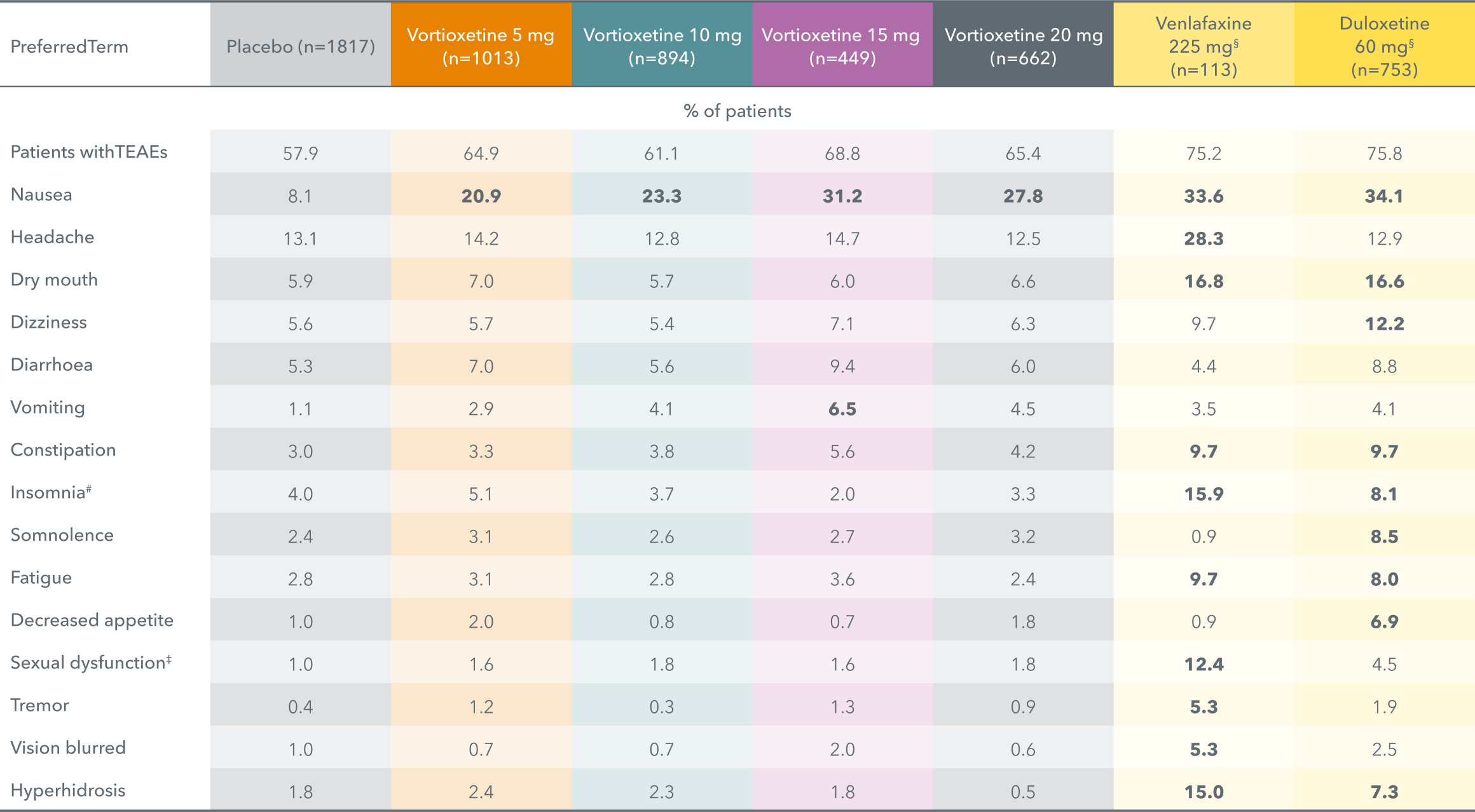 Adapted from: Baldwin DS et al. 2016a. % values in bold are ≥5% and >2 x placebo.