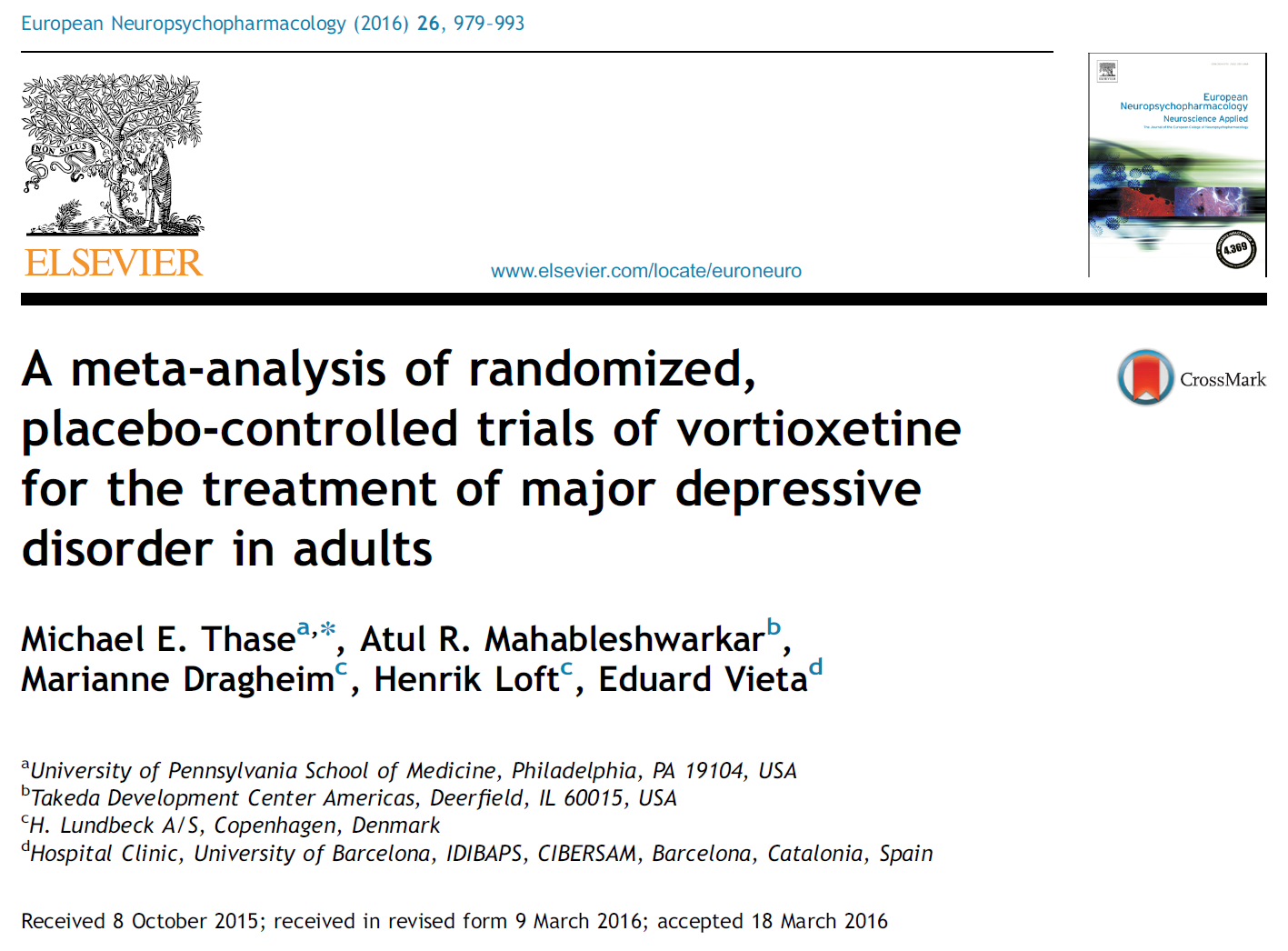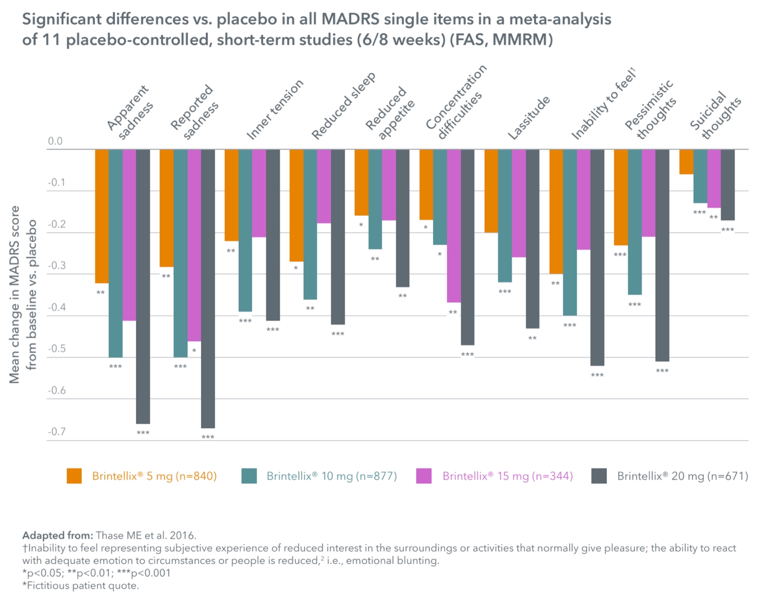 6주-8주간 Brintellix® 허가 용량(5mg-20mg/d)에서 용량에 따른 임상적 효과 정도를 평가한 메타 분석 연구입니다. Baseline 대비 endpoint(6주 or 8주)에서 MADRS 총 변화량을 측정한 결과 Brintellix®는 성인 MDD 치료에 효과적이며, 용량 증가에 따라 치료 효과 또한 증가하였습니다.