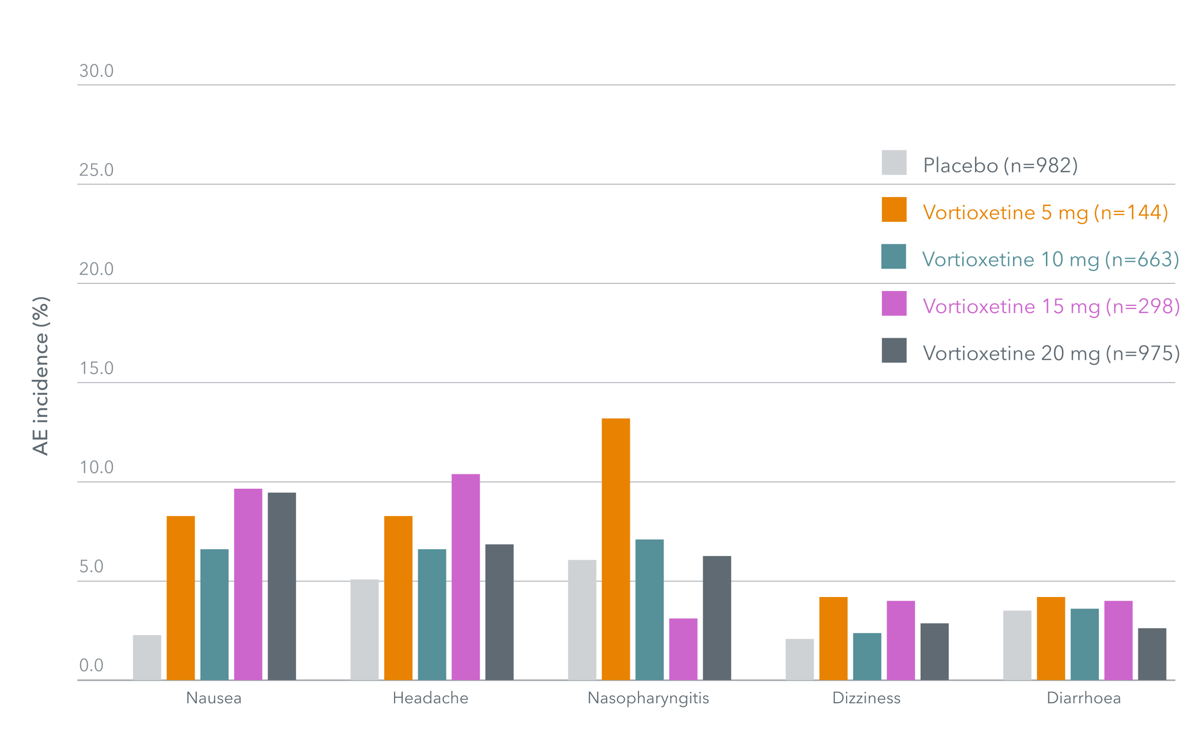 ‡ 1개 이상 투여군에서 발생률이 4% 이상인 TEAE만 제시. 이러한 고정 용량 시험에서 보티옥세틴 20mg을 투여받도록 배정된 환자들은 8주 중 첫 주에 10mg 용량을 복용함. 6건의 단기, 고정 용량, 위약 대조 시험의 메타 분석에 따른 데이터.1