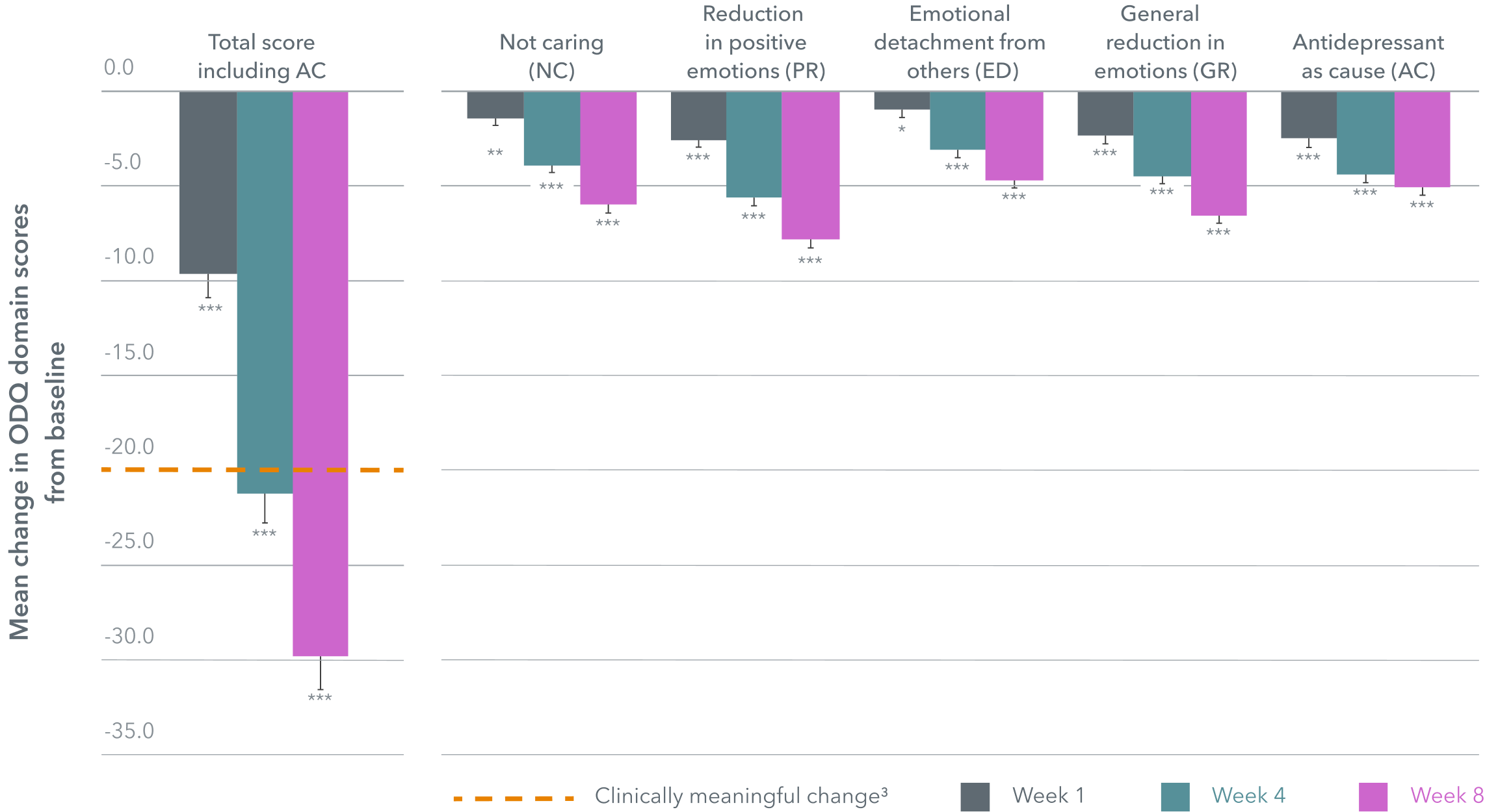 이 시험에 참여한 모든 환자는 베이스라인에서 상당한 감정 둔화(ODQ≥50)를 보고하였는데, ODQ 총점 평균은 89.4점이었습니다.1 브린텔릭스® 8주 투여 후 환자군(N=143)의 ODQ 총점이 29.8점 감소하였습니다(p<0.0001).1 무심함, 감정적 분리, 긍정적 태도 감소, 전반적 저하, 그리고 항우울제 기인성 등 모든 ODQ 세부 항목이 1, 4, 8주 차에 유의하게 개선되었습니다. 브린텔릭스®는 4주 차 및 8주 차에 감정 둔화를 임상적으로 유의하게¶ 완화하였습니다.1,3